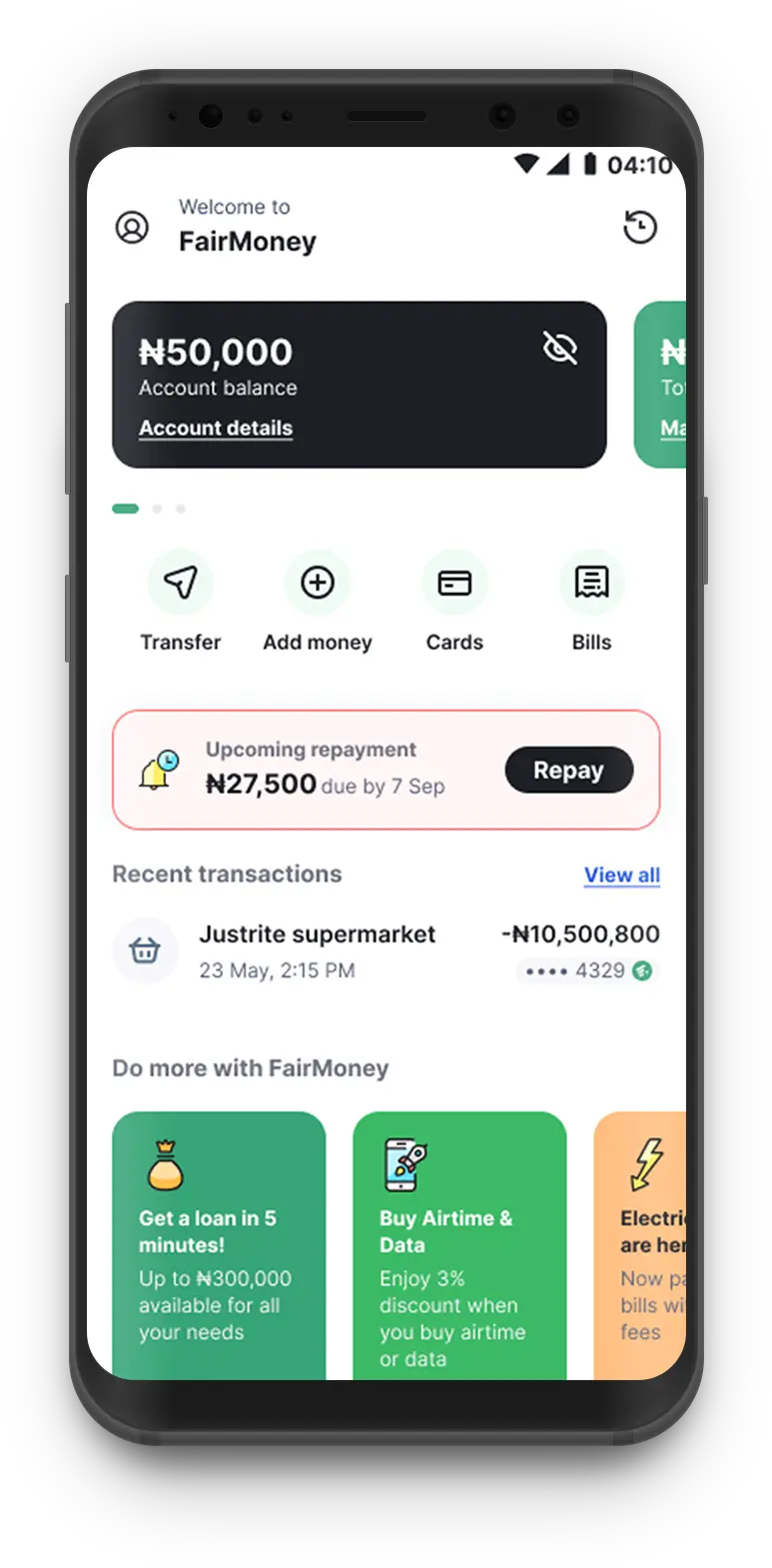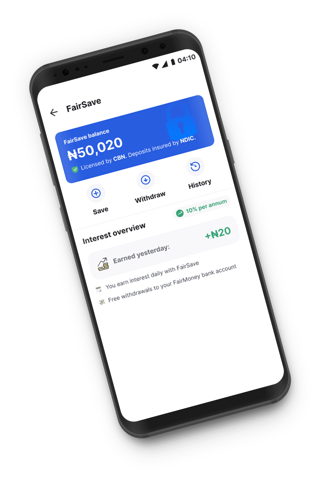 Get Quick Loans In 5 minutes (Up To ₦1,000,000),No Collateral Achieve your goals faster with FairLock (Fixed term deposits) & earn up to 24% interest P.A.